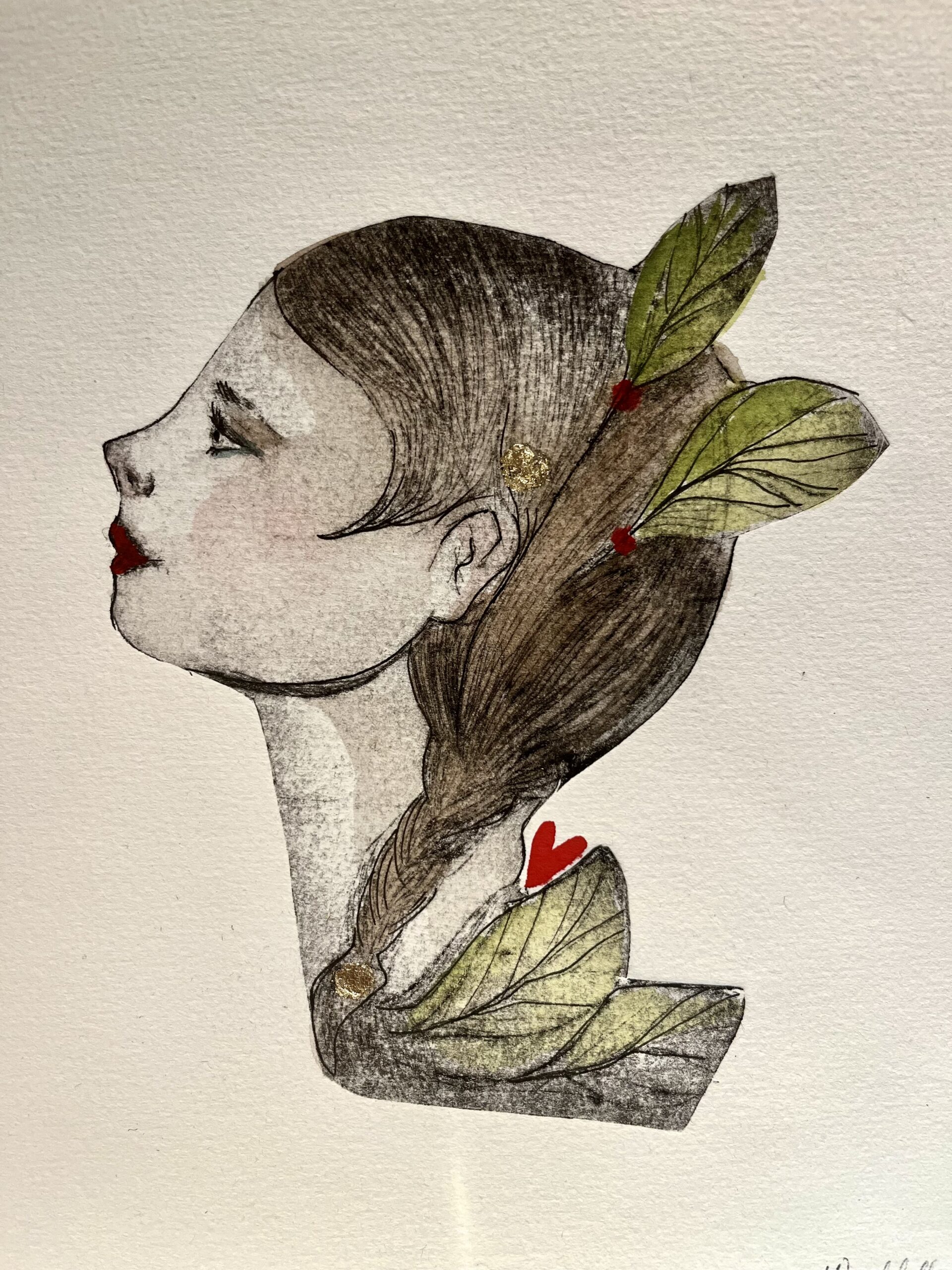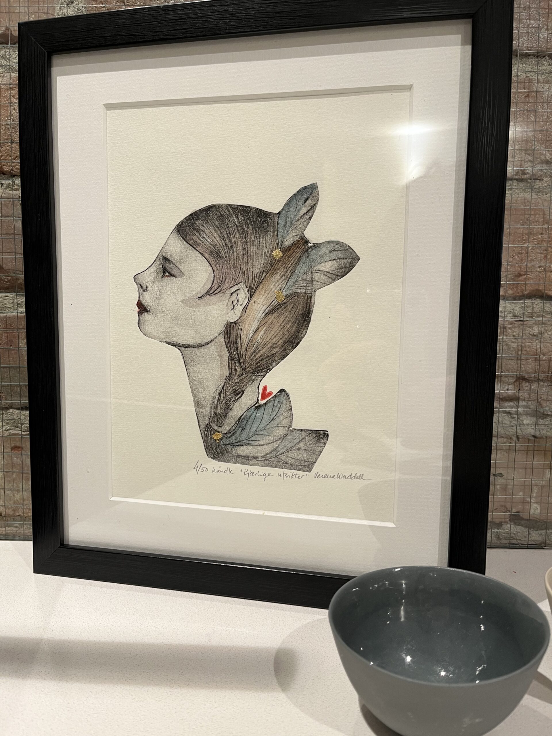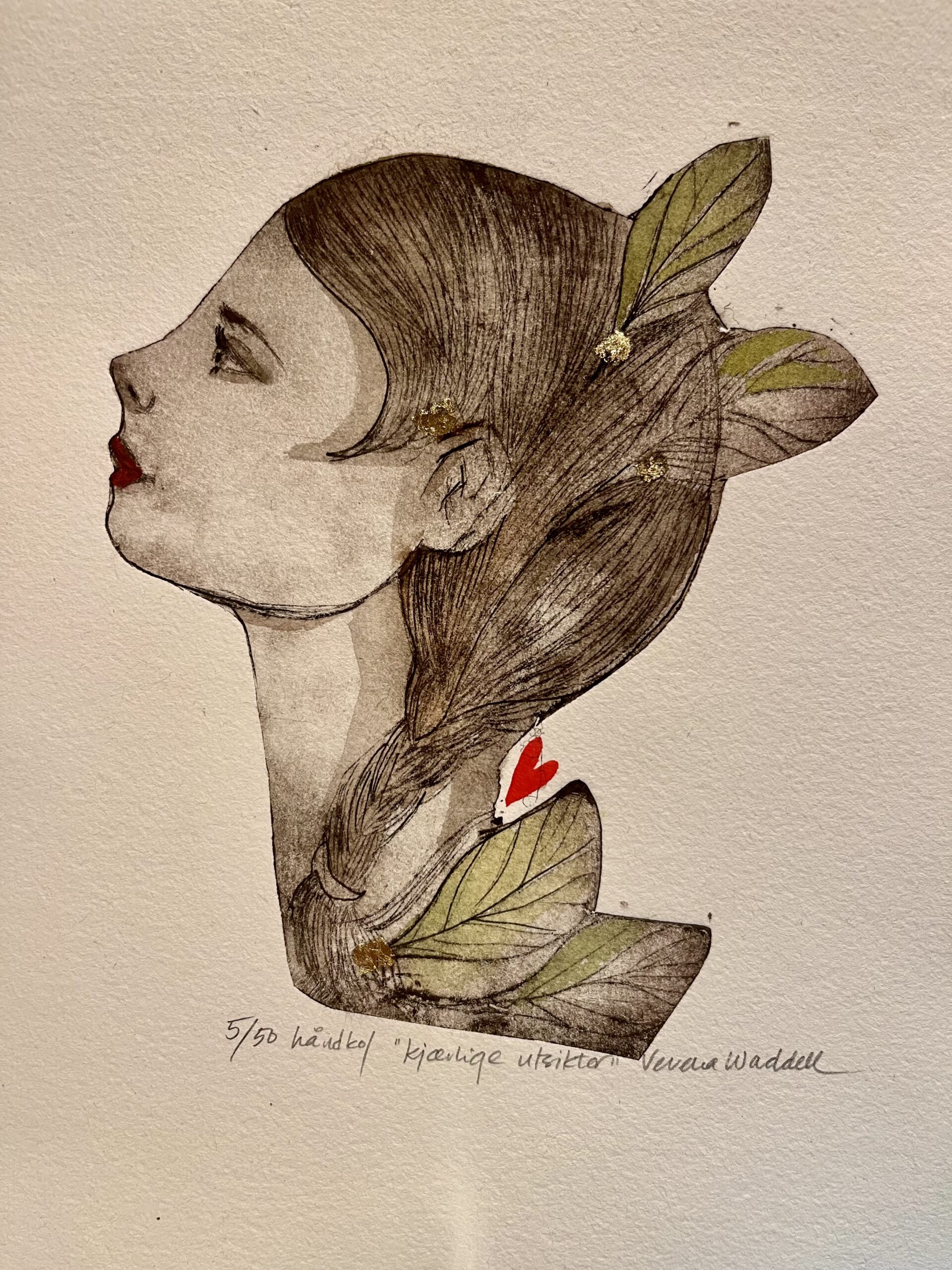 Filled with love and good intentions. This handprinted and handcoloured drypoint measures 21×29 cm with a frame.