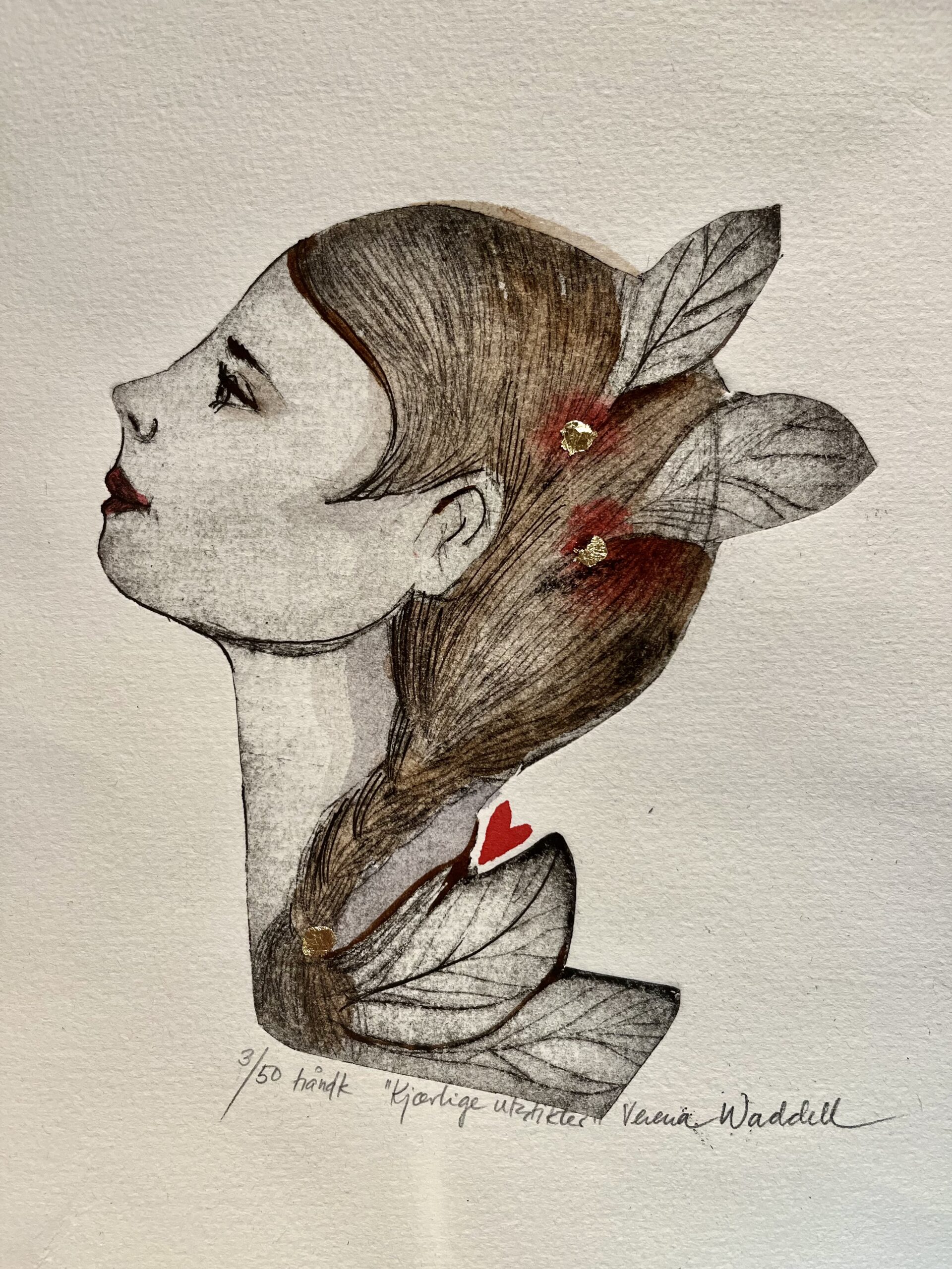 Fullt med kjærlighet og gode intensjoner er denne originalgrafikken. Håndkolorert ink bladgull ,måler 21x29cm med ramme .