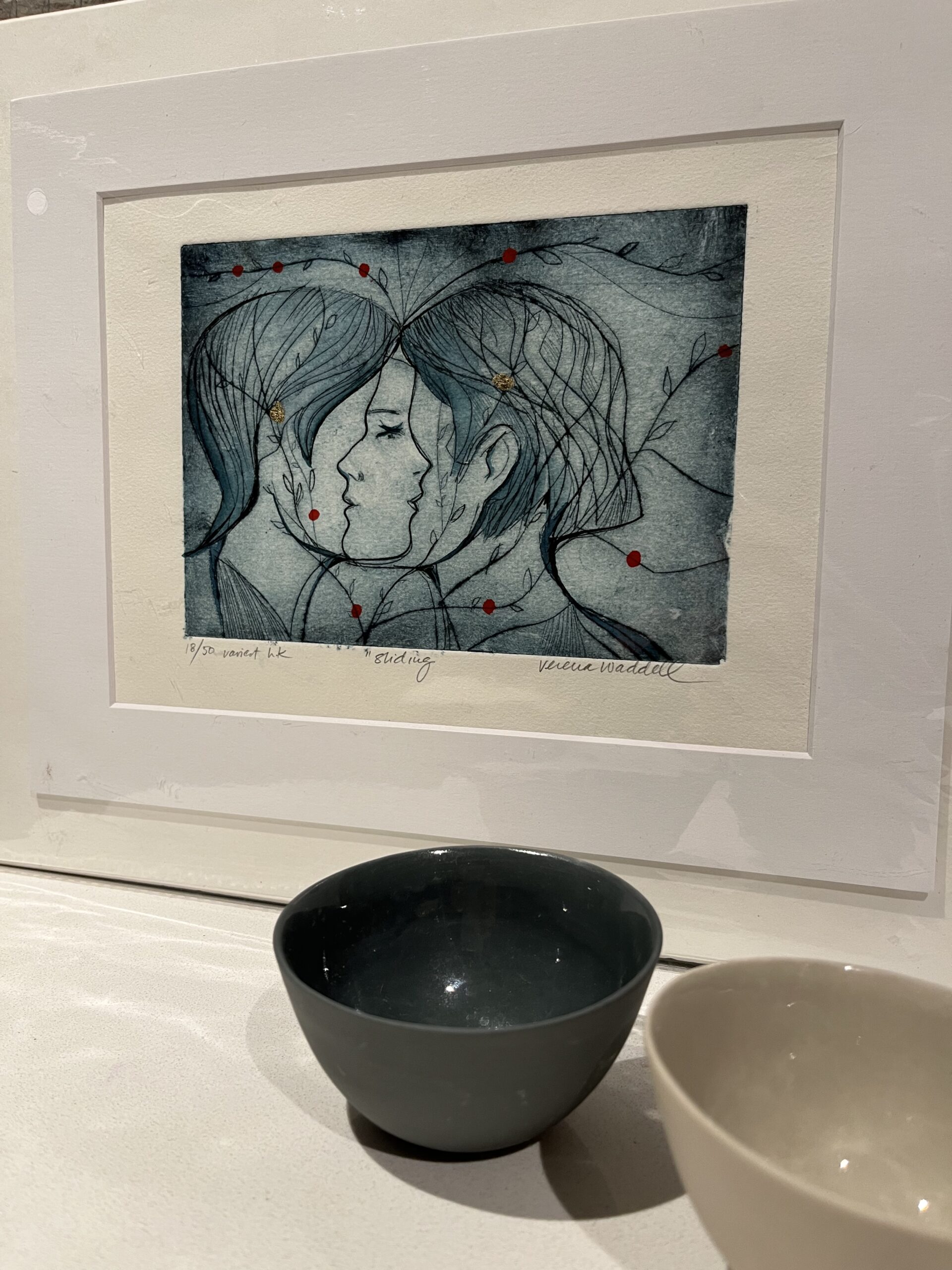 ‘Sliding’ deler hverandre med kjærlighet og gode intensjoner i denne originalgrafikken. Håndkolorert ink bladgull ,måler 21x29cm med ramme .