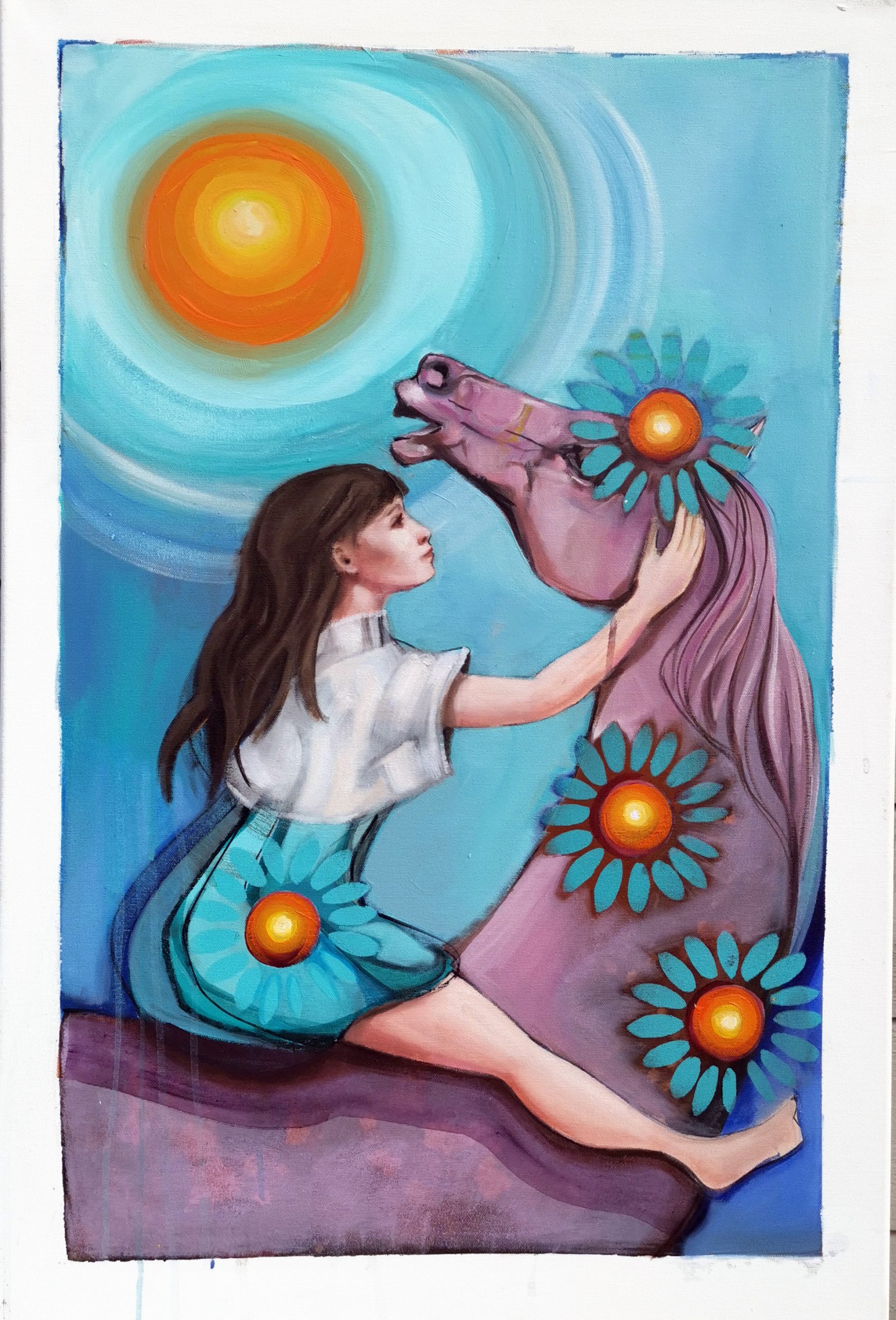 Solen, del av 22 bilder malt inspirert av Major Arcana En lys reise, der hvert bilde er tolket fritt og inviterer deg til egen reise og refleksjon, måler A 3 uten ramme og 45 x 65 inkludert ramme, pris er uten ramme. Trykket har opplag på 120 The Sun, part of 22 paintings painted inspired by Major Arcana A bright journey, where each image is interpreted freely and invites you to your own journey and reflection, measures A 3 without frame and 45 x 65 including frame, price is without frame. The print is in edition of 120